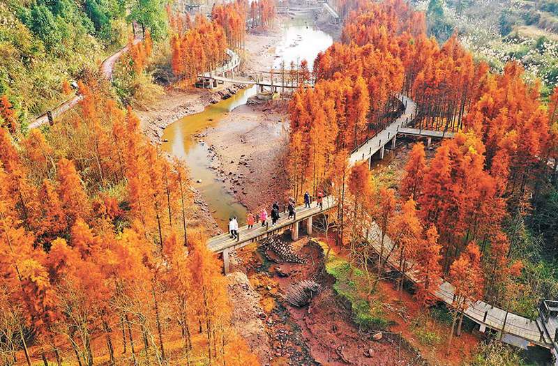 萬盛經開區青山湖濕地公園,國家一級重點保護野生植物水杉樹葉變紅,景色宛若油畫。(資料圖片)特約攝影 曹永龍\視覺重慶