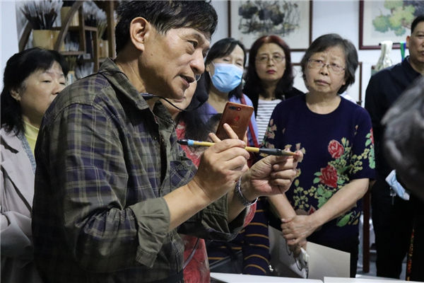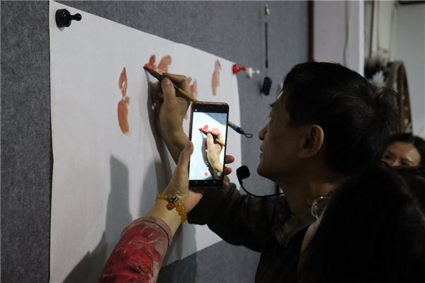 陳勇示范珍珠魚畫法。馬春鵬攝