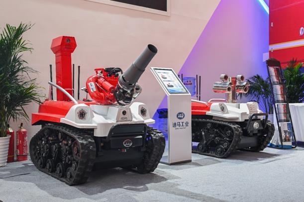 此外,迪馬工業自主生產研發的新一代智能消防機器人也是本次參展的一大亮點。新一代智能消防機器人分為滅火偵察機器人和偵察機器人。其中,滅火偵察機器人主要以滅火為主,偵查機器人主要以偵查為主,適用于各種大型危險化學品、大跨度商業建筑、工廠、商貿企業、礦山、隧道、地鐵、倉庫、飛機庫、船舶等災害隱患多發地,替代消防員在?;饒龌驖鉄熁馂默F場進行滅火救援,采集危險物質樣本,進行理化性質分析,并將信息傳輸至功能偵檢消防車及現場指揮部指揮終端,為指揮員提供指揮決策依據。