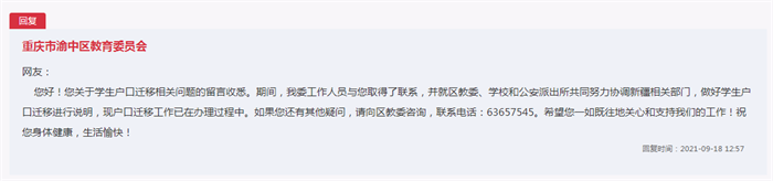 9月18日,渝中區教委在給李女士留言回復中稱:您好!您關于學生戶口遷移相關問題的留言收悉。期間,我委工作人員與您取得了聯系,并就區教委、學校和公安派出所共同努力協調新疆相關部門,做好學生戶口遷移進行說明,現戶口遷移工作已在辦理過程中。希望您一如既往地關心和支持我們的工作!祝您身體健康,生活愉快!