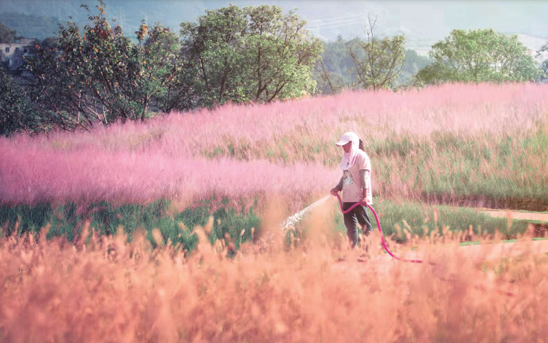 廣陽島生態修復工程啟動后,這里運用“理水、豐草”兩大策略,整理地形、改良土壤,引表蓄流,梳理生態草溝、匯水形成雨水花園,打造出連綿起伏、錯落有致的粉黛夢境和浪漫花田場景,成為探索巴渝農田藝術化種植的綠色發展示范。
