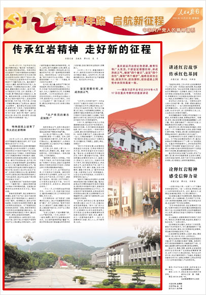2019年4月17日,習近平總書記在重慶考察時指出:“重慶是一塊英雄的土地,有著光榮的革命傳統。毛澤東同志在這里進行了決定中國前途命運的重慶談判,周恩來同志領導中共中央南方局在這里同反動勢力展開了堅決斗爭,鄧小平同志在這里領導中共中央西南局進行了大量開創性工作。重慶涌現了大批大義凜然、高風亮節的共產黨人,如信仰堅定、不怕犧牲的趙世炎等人,英勇善戰、屢建功績的王良等人,堅貞不屈、永不叛黨的江竹筠、王樸、陳然等人,嚴守紀律、勇于犧牲的戰斗英雄邱少云,等等。解放戰爭時期,眾多被關押在渣滓洞、白公館的中國共產黨人,經受住種種酷刑折磨,不折不撓、寧死不屈,為中國人民解放事業獻出了寶貴生命,凝結成‘紅巖精神’。重慶要運用這些紅色資源,教育引導廣大黨員、干部堅定理想信仰,養成浩然正氣,增強‘四個意識’、堅定‘四個自信’、做到‘兩個維護’,始終在政治立場、政治方向、政治原則、政治道路上同黨中央保持高度一致!