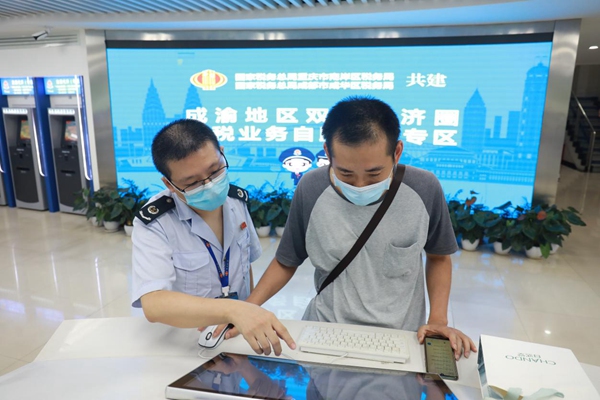 在重慶市南岸區稅務局辦稅服務廳成渝地區雙城經濟圈涉稅服務自助通辦專區,稅務人員輔導市民辦理跨區域涉稅事宜。蔣宜非 攝
