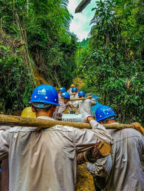 國網重慶豐都供電公司電力員工肩挑背扛在山間小道上搬運變壓器。劉遠平攝