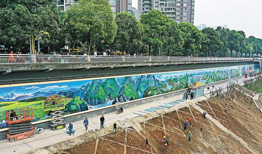 10月25日,南岸南濱路雅巴洞江岸,“長江生態人文畫卷”正在繪制中。這是兩江四岸品質提升工程的一部分,該油畫長300多米、高5米,內容包括長江源頭、重慶兩江四岸、石寶寨、白帝城、巫峽紅葉、黃鶴樓、黃山、蘇州園林等長江流域景點,將在兩個月后全部完成。特約攝影 鐘志兵/視覺重慶
