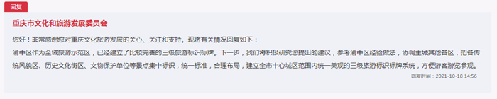 王同學在留言中說到,重慶歷史悠久,文化旅游資源極其豐富。重慶市內各類文物保護單位、文物點、其他未定級的不可移動文物、各類A級景區、各類歷史文化街區和傳統風貌區、各級風景名勝區,都是不可多得的旅游資源。但是,目前來看,除了渝中區作為全域旅游示范區,其旅游標識標牌系統比較完善,建立了比較統一的三級旅游標識標牌外,其他各區的旅游標識都極不統一。