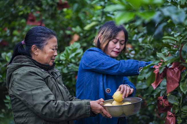 黃紅梅和婆婆龍緒淑摘廣柑。黃進攝