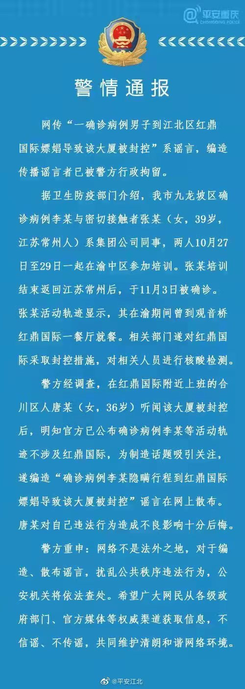 人民網重慶11月5日電 (劉政寧)5日,重慶市公安局江北區分局發布警情通報:網傳“一確診病例男子到江北區紅鼎國際嫖娼導致該大廈被封控”系謠言,編造傳播謠言者已被警方行政拘留。