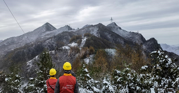 在巫溪縣雞心嶺,國網重慶檢修公司輸電運檢一班成員對±800千伏祁韶線開展冰雪天氣特巡。山脊上寒風陣陣,工作環境惡劣,輸電運檢人員腳踏積雪,頂著凜冽的寒風開展線路特巡檢查工作,巡視人員用無人機、望遠鏡、風速儀等設備對線路和觀冰站設施進行檢查和測量,并對線路走廊、導地線、絕緣子串等全面檢查。