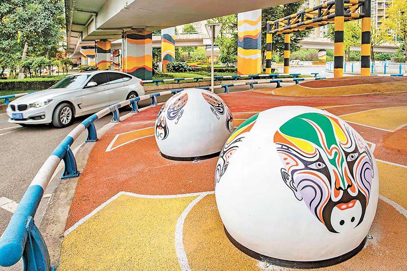 在金開大道川劇院旁、古木峰立交橋下,原本單調的橋柱被涂上了川劇元素,之前雜亂無章的綠地空間也進行了重新梳理,50余盞川劇臉譜燈引人注目。目前,該項目已經接近尾聲,預計12月初正式亮燈。
