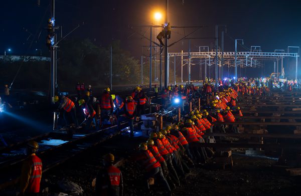 人民網重慶11月15日電 11月14日凌晨2點,由中鐵十一局集團承建的萬州北站改造工程現場燈火通明,300多鐵路工人齊心協力,用劃龍舟的方式,將最后一組道岔推到指定位置。