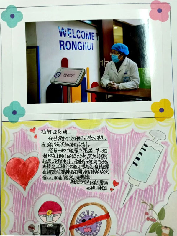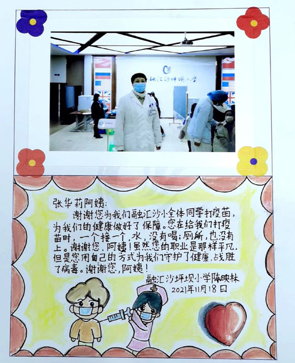 人民網重慶11月20日電 “是您,輕聲細語地安慰我們,讓我們不再害怕;您雖然做著平凡的工作,卻用自己的方式為我們守護了健康……”近日,重慶市沙坪壩區人民醫院的醫護人員走進融匯沙坪壩小學,為孩子們接種新冠病毒滅活疫苗。忙了一天后,孩子們用充滿童趣的的方式表達了心中的愛和感恩。