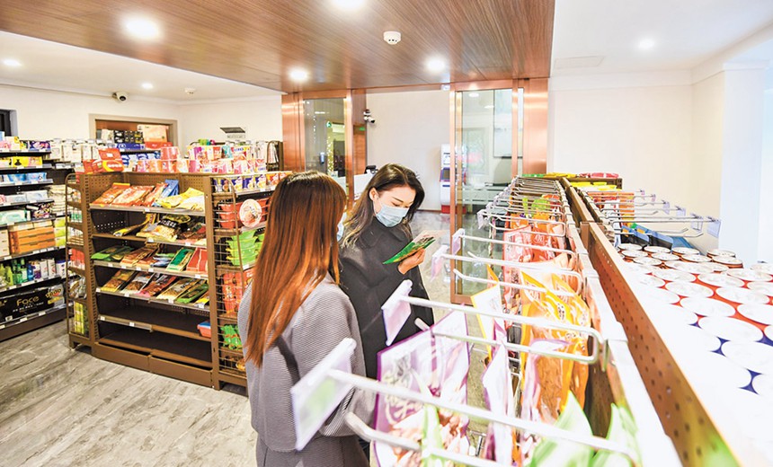 入住的青年正在公寓內的超市購買商品。