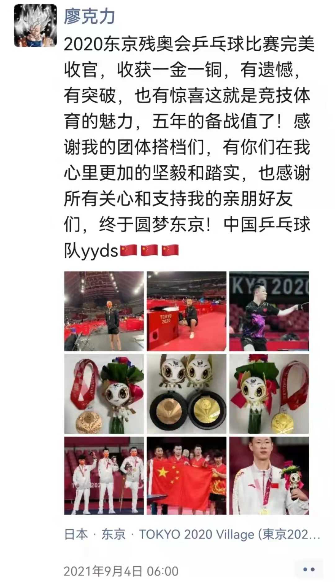 “收獲一金一銅,有遺憾,有突破,也有驚喜,這就是競技體育的魅力,五年的備戰值了。感謝我的團體搭檔們,有你們在我心里更加堅毅和踏實,也感謝所有關心和支持我的親朋好友們,終于圓夢東京,中國乒乓球隊yyds!