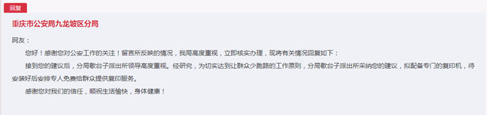 12月2日,重慶市公安局九龍坡區分局回復稱,感謝您對公安工作的關注!經研究,為切實達到讓群眾少跑路的工作原則,分局歇臺子派出所采納您的建議,擬配備專門的復印機,待安裝好后安排專人免費給群眾提供復印服務。