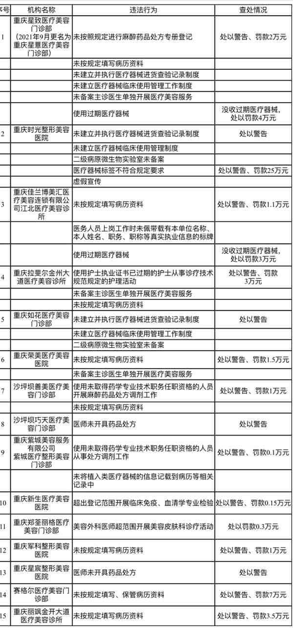 12月7日,重慶市衛生健康綜合行政執法總隊通報了2021年重慶市“你點名 我監督”跨部門聯合執法跨地區交叉檢查結果,15家醫療美容機構(如下圖)被立案調查,涉及星致、時光等醫療美容機構,重慶時光整形美容醫院最高被罰25萬元。