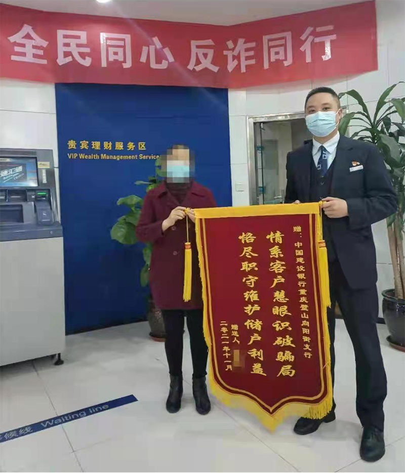 11月初的一天,一客戶為建行璧山向陽街支行送來一面錦旗。原來就在前一天,該客戶辦理轉賬業務時,建行工作人員發現其不停翻看手機且神色緊張。出于職業敏感,網點負責人決定暫停為其辦理轉款業務并向其詢問轉賬緣由,經反復溝通,工作人員判斷出該客戶疑似遭遇網絡詐騙,于是不斷向其解釋和普及“合伙人”騙局等網絡詐騙案例,最終幫助客戶避免了大額經濟損失。