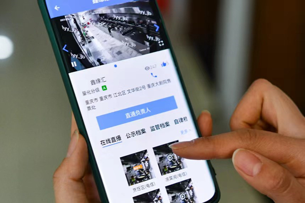 “我們點擊‘美團’‘餓了么’外賣平臺上面店鋪的商家信息,就能看到實時的攝像畫面,我們的網格監察員就是隨時查看店鋪是否有,廚房人員未戴口罩、后廚臟亂等多種違規操作!苯眳^市場監管局副局長艾渝說。