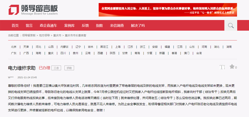 人民網重慶12月14日電 (陳琦)家門口的電線桿,年久失修,破損十分嚴重,反映多次無果……11月24日,有網友在人民網“領導留言板”留言,希望維修人員能盡快上門維修,確保家里用電安全。收到留言后,重慶市綦江區橫山鎮相關部門介入,該網友反映的問題得到了解決。
