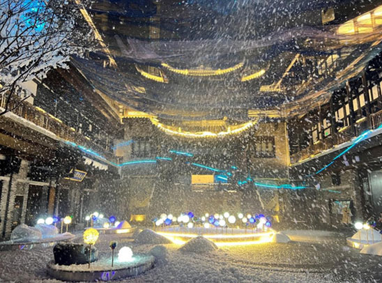 DV(dream view)沉浸式視角,1000坪極光天幕,躺在院子里仰望天空,會看到流動的北極光、漫天的飛雪,身臨其境的奇幻感,穿過漫長的億萬光年在這里與極光相遇。極光和大雪將每日在長嘉匯王家大院上演,市民均可前往“重慶長嘉匯購物公園”微信公眾號免費預約觀賞。