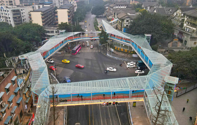 南坪西路空中聯廊項目位于南坪商圈西部,連接南坪西路、海銅路和花園路。項目全長287.7米,天橋主體結構為組合鋼箱梁鋼橋體、鋼筋混凝土橋墩,最大跨度42米。聯廊采用極簡現代設計,外觀借助中國傳統民居“坡屋頂”樣式,頂棚采用多斜面納米自潔玻璃,整體風格與旁邊的重慶映象商業街協調輝映。