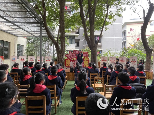 “紅巖小導游”在重慶市沙坪壩區四川外國語大學附屬小學映山紅故事苑講紅色故事。人民網 胡虹攝