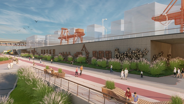 茄子溪段項目北至萬發碼頭、南至濱江路跨線橋、總長度2.4公里,總面積49.2公頃。結合港口的發展歷史和遺留下來的工業遺產,將港口文化代表的現代國際與潮流音樂代表的前沿藝術相融合,提出潮流音樂港的主題定位。針對現狀單調的線性空間,設計通過港口轉型,江岸活力道,生態環境微平臺等打造,打造一條具有韻律變化的潮音水岸,未來成為重慶聚集潮流文化的新地標。