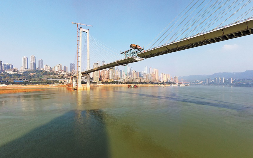 南紀門長江軌道專用橋是軌道10號線二期工程的關鍵控制工程,全橋總長1224米、寬20米,共設9個墩臺,為五跨高低塔雙索面斜拉橋。專用橋建成后將有效分流軌道3號線南北向客流,緩解渝中半島與江北、南岸間的跨江交通壓力,完善城市軌道交通線網格局。