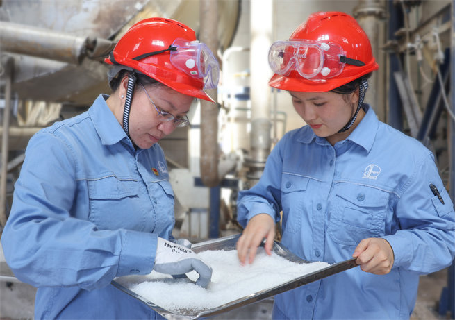 技術人員對聚乙烯醇產品進行人工抽檢。川維化工供圖
