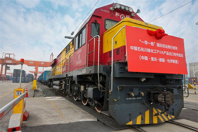 人民網重慶12月24日電 近日,滿載1000余噸中國石化聚乙烯醇(PVA)產品的“中歐”火車專列從重慶發出,將歷時二十多天、途經五個國家,一萬多公里的長途跋涉到達德國杜伊斯堡。據悉,這是借助重慶連接歐洲的“中歐國際鐵路聯運班列”,首次開通火車專列向歐洲客戶運輸精細化工產品。