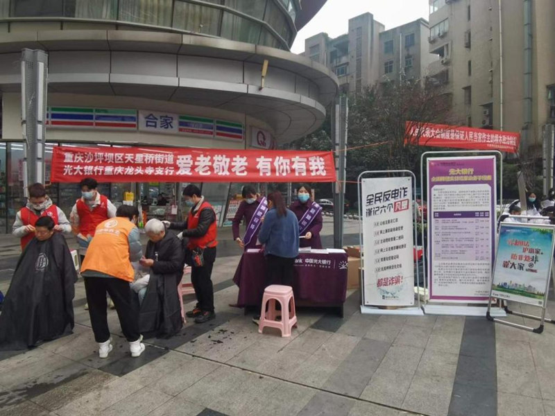 12月9日,光大銀行重慶龍頭寺支行聯合沙坪壩區天星橋社區開展了一場“助力敬老,陽光相伴”義務活動,幫助社區老人免費測量血壓,提供義務理發。