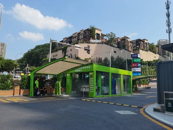 玥湖路充換電綜合服務站環保洗車區域。張艷攝