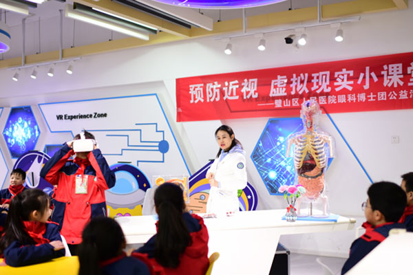 課堂上,璧山區人民醫院眼科博士團通過“虛擬現實VR技術”介紹了雙眼視覺基礎、調節與近視的關系、讓孩子感知雙眼單視帶來的立體視覺的感受,并讓孩子們近距離體驗“虛擬現實+醫療”的神奇魅力,讓孩子們認識到預防近視的重要意義。