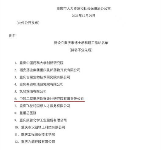 人民網重慶1月4日電 近日,重慶市人力資源和社會保障局公布最新獲批的12家市級博士后科研工作站。據了解,唯一上榜的勘察設計單位,是曾經設計出重慶首條高速鐵路的中鐵二院重慶公司。