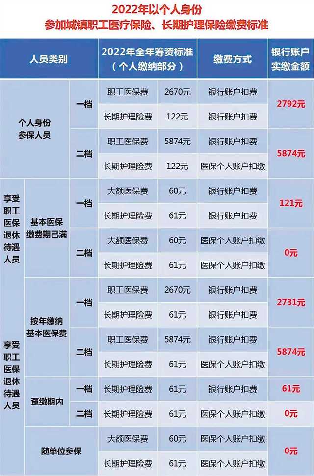 據介紹,2022年,以個人身份參加職工醫保按年度繳費的繳費基數及繳費期內個人賬戶資金劃入基數為53400元(4450元/月)。一檔繳費標準為2670元/年·人,二檔繳費標準為5874元/年·人。