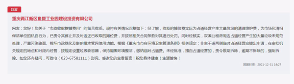 針對留言,重慶兩江新區魚復工業園建設投資有限公司回復,經了解,收取的攤位費實際為占道經營產生大量垃圾的清理維護費,為市場化清掃保潔單位的私自行為,已責令其停止并及時返還已收取的攤位費,并按照相關合同條款對其進行處罰。