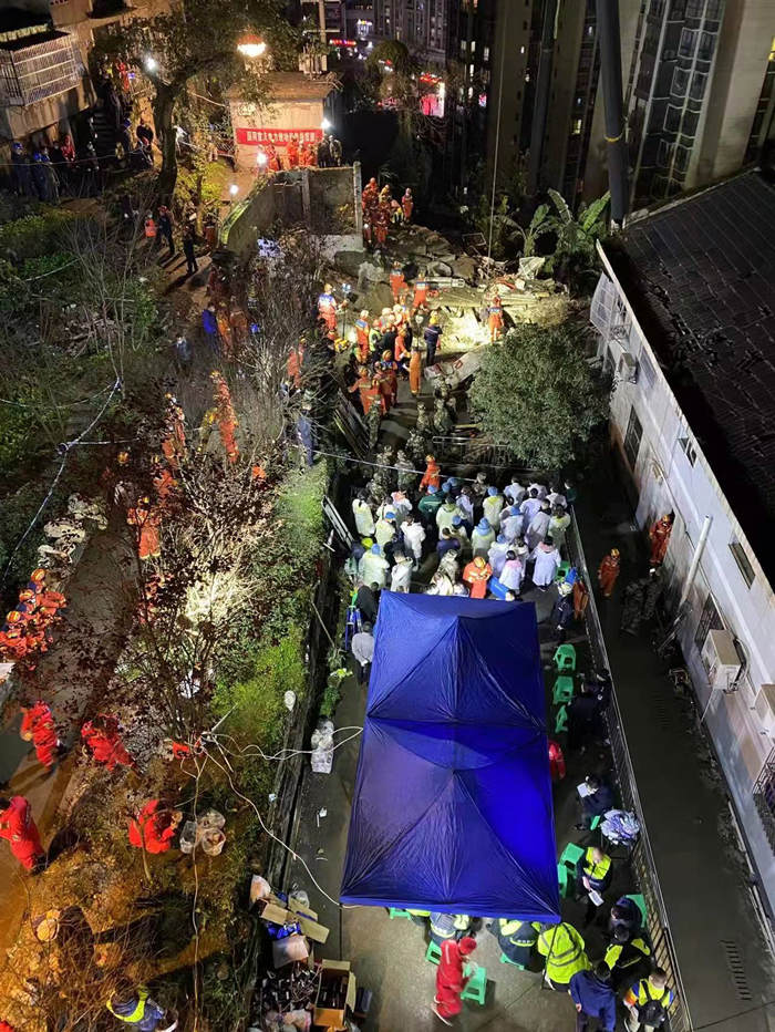 在重慶市委市政府堅強領導和國家應急管理部、國家住房和城鄉建設部有力指導下,市、區應急、消防、公安、醫療等方面力量,全力參與被困人員科學搜救、受傷人員醫療救治等工作。共派出消防救援隊、應急救援隊、民兵預備役等588人,吊車2臺、消防車6臺、救護車20臺,其他器具若干,開展被困人員搜救工作。