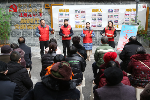 人民網重慶1月11日電 “全會精神放光芒,合陽人民學習忙,擲地有聲有信念,傳揚!”1月10日下午,合川區合陽城街道瑞山路社區社稷壇94號院壩里,群眾圍坐在“百姓茶館”前,參加1月“合陽老友薈”新時代文明實踐志愿服務活動。志愿者們說著接地氣的“三句半”,把黨的十九屆六中全會精神轉化為“地方話”,通俗易懂的語言、喜聞樂見的形式,贏得觀眾的陣陣喝彩。