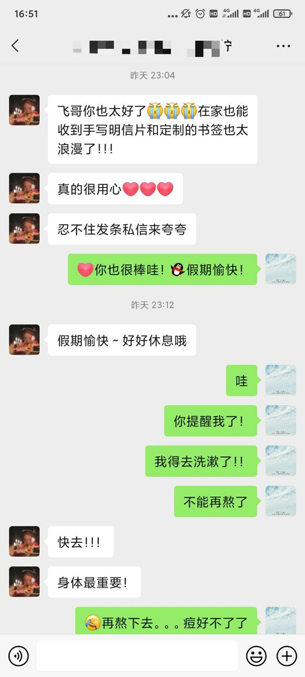 “不止是期末給我們每個人一封專屬信,飛哥一直都很暖!拔髂洗髮W音樂學院2021級崔同學稱,飛哥很有心,他入學報到第一天,飛哥來寢室,居然喊出了他的名字。
