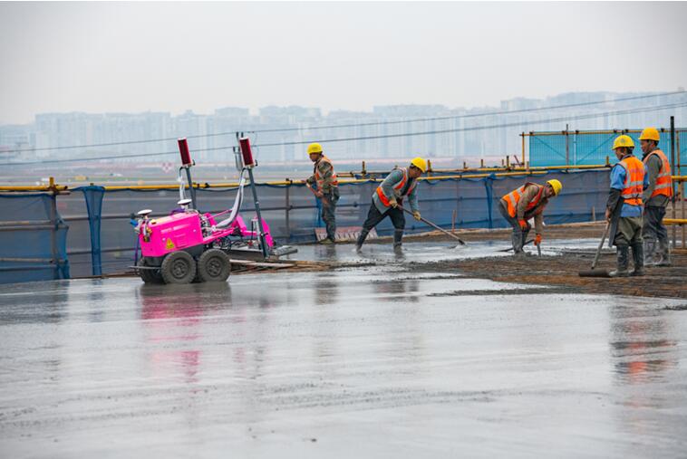 項目施工過程中,充分運用人工智能技術,提高作業效率。在J指廊工地上,一個外形像推土機的粉紅色機器人在工作人員“指揮”下,往返在剛剛澆筑的混凝土上開展初步平整施工--它就是地面整平機器人。