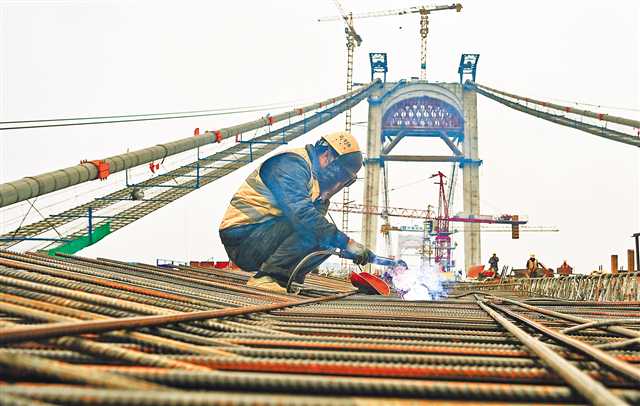 1月24日,郭家沱長江大橋施工現場,工人正在加緊作業。臨近春節,郭家沱長江大橋的建設者們堅守崗位,加緊施工,確保工程進度。目前大橋已吊裝39片鋼桁梁,完成總進度的67%。
