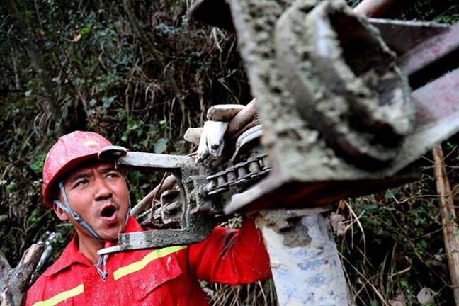 鉆井員工深溝險壑中,艱難搬遷鉆機。西南物探分公司供圖