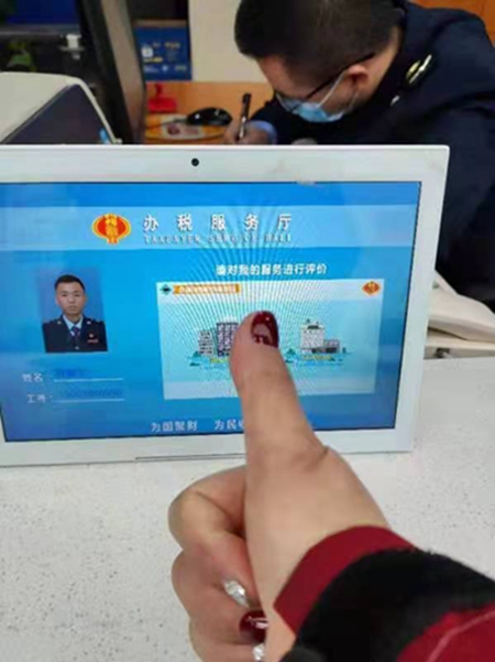 “請對我的服務進行評價?!痹诖翱谵k理完業務的人員,都會在窗口設備收到這樣的提示。何某看見后,便在程鵬宇的評價窗口前豎著右手大拇指,拍下了照片。