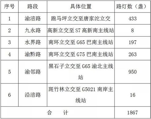 工程涉及渝涪路、渝鄰路、九永路、水界路等6條繞城以內高速路段(成渝路待改擴建時一并實施,渝廣路因市政施工短期內無法施工),共計安裝路燈1800余盞,燈具光源均采用高顯色的LED燈,具有高效、安全、節能、環保、顯色指數高特點。高速公路相關單位嚴格按照市交通局、市城管局相關規范要求進行施工,抓住重要施工節點,嚴保工程“質量關”確保這一民心工程保質保量、按時完成。
