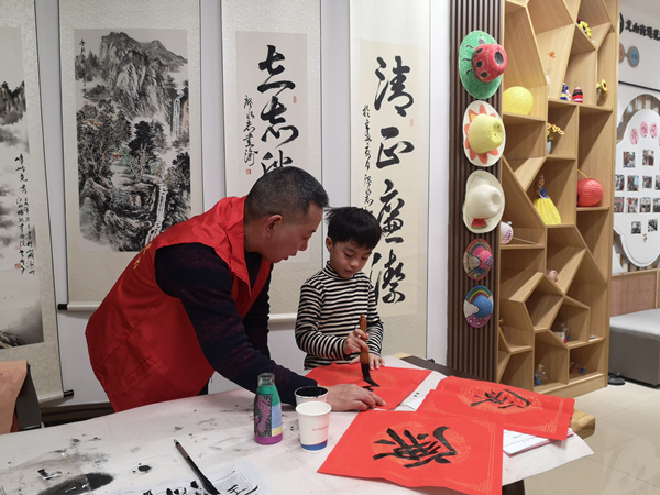 志愿者指導小朋友寫書法作品;▓@新村社區供圖