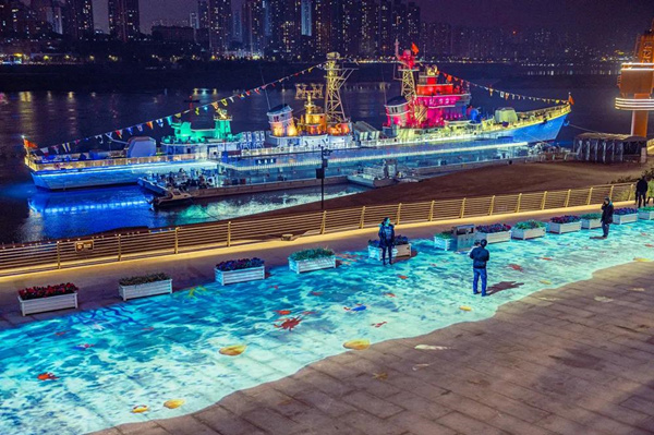 在重慶建川海疆博物館景區內,15臺激光投影儀將一條兩百多米長的沙灘投射在了地面:海浪不時拍打在沙灘上,不少魚、蝦、螃蟹正在水里游動,非常逼真。同時,為了增添景區夜間的觀賞性,制作方還采用了雷達技術,讓游客得到沉浸式的互動體驗:當人在沙灘上來回散步時,腳下會出現一朵朵浪花,仿佛讓人身臨其境。