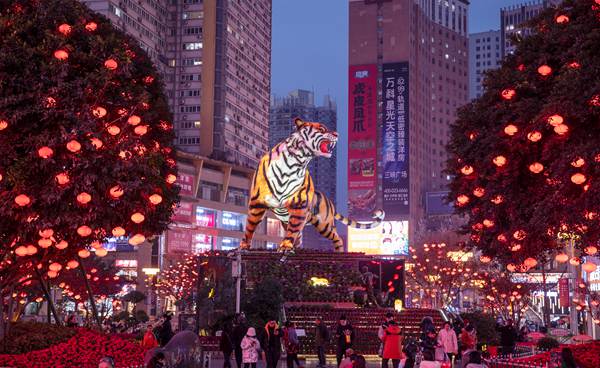 在三峽廣場轉了一大圈,燈飾確如楊佳所說,別致精美、恢弘大氣,獨具審美情趣,更點亮了夜空,照耀出年味。燈飾分為“金虎迎新開門紅”“詩意沙坪壩”“箏鳴琴瑟天下幽”“勿忘黃天厚土滋潤”四個主題部分,與商圈景觀結合,使用祈福燈、紅楓等多種燈飾及造型景觀,重現了虎嘯山林、花燈祈福、農家風情以及詩意沙坪壩等多重景象。