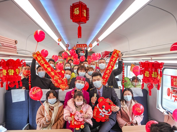 1月28日,C451次列車上張燈結彩、歡聲笑語!案魑宦每,除夕即將來臨,在這辭舊迎新之際,我們歡聚一堂,敬請大家觀看由我們鐵路職工帶來的高鐵‘春晚’!彪S著列車長王華的邀請,旅客們紛紛就坐在鐵路職工精心布置的車廂。車窗上粘貼的喜慶窗花、五彩的燈籠和拉花.......一股濃濃的年味撲面而來,讓整個車廂氣氛熱情洋溢,溫馨盎然。
