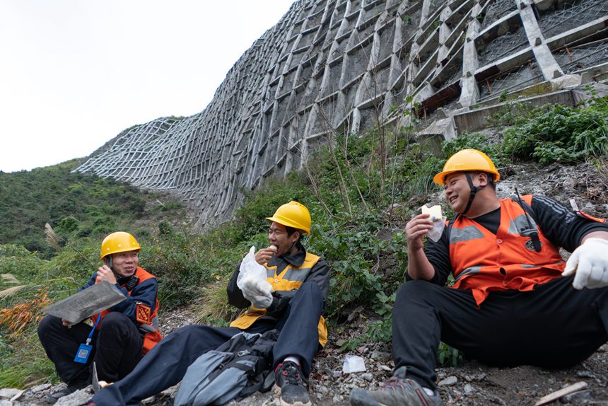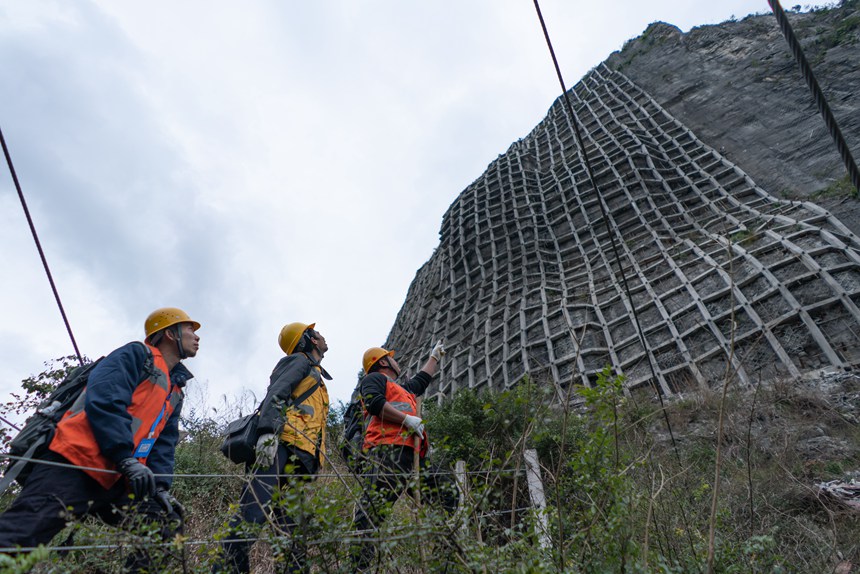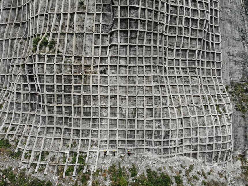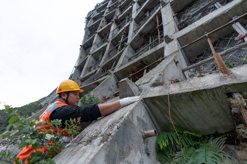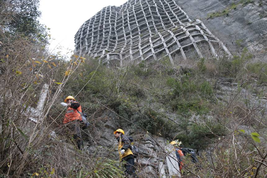 擔心工友的安全,盡管說的是玩笑話,方劍語氣也帶著認真。他一邊組織大家做好安全防護,一邊提醒著作業安全。設備檢查過程中,他帶著4名職工一步一停頓地橫著山體向前移動,對防護設施底部每一根橫豎交叉的混凝土框架梁進行仔細檢查。每檢查一處,他們都要在現場和工作本上做好記錄。