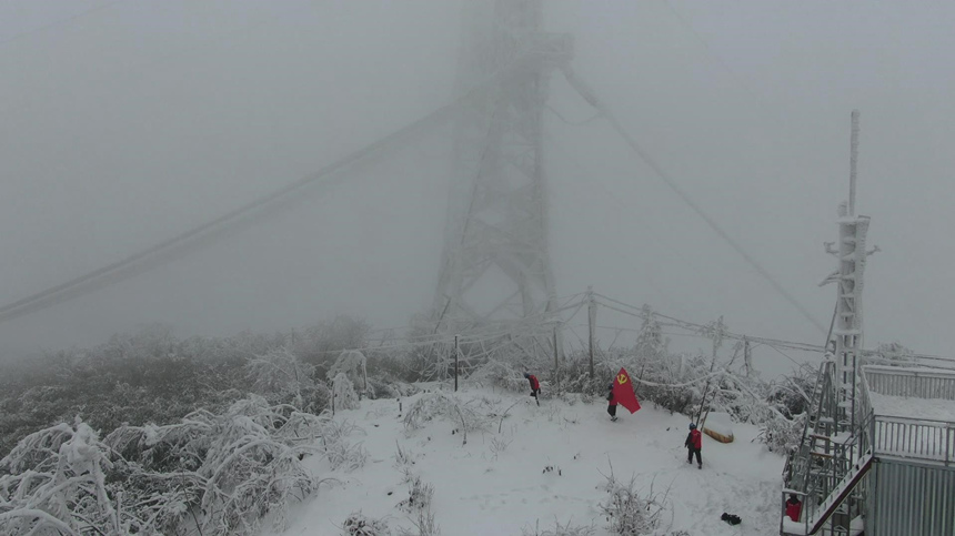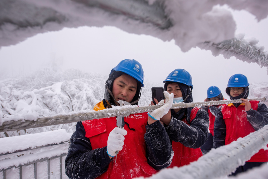 國網重慶城口供電公司員工楊順安、冉昊天在220千伏華城線237號塔測量覆冰厚度。牟丹陽攝